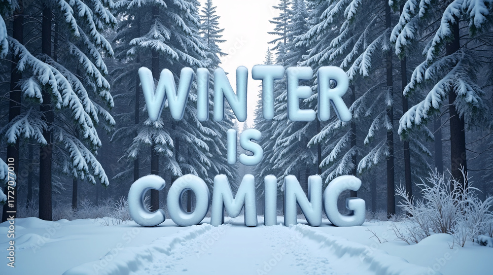 A striking winter forest scene with snow-covered trees and frosty typography, encapsulating the quiet majesty and chill of the winter season. #1727077010