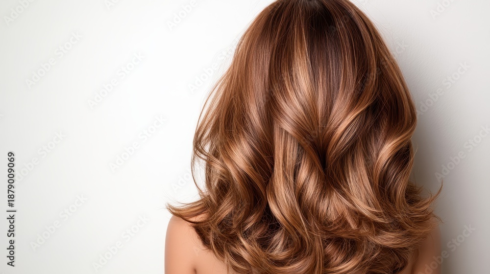 A stunning back view of a woman showcasing her long, shiny brown hair, highlighting the smoothness and richness of the hair's color against a clean background. #1879009069