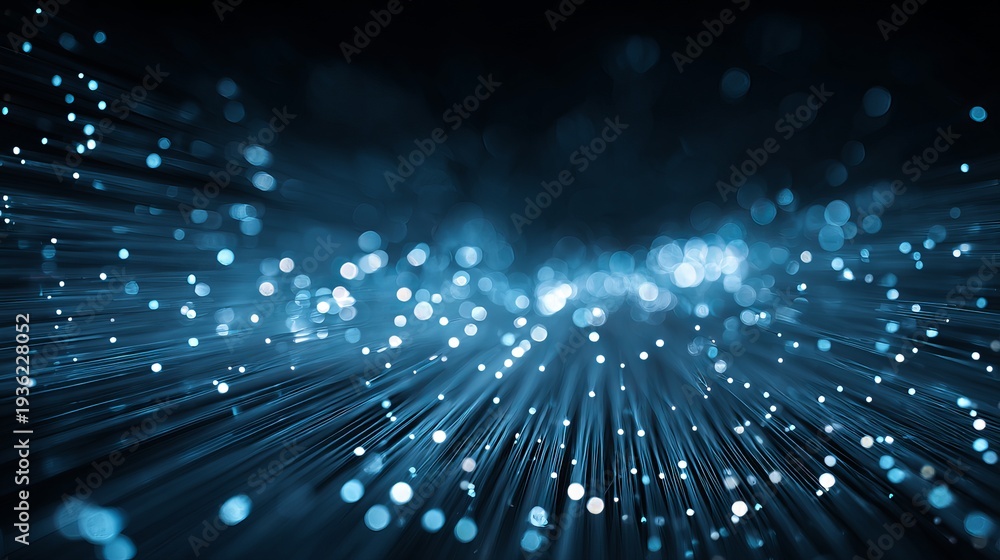 A stunning visual representation of fiber optic cables with glowing blue light particles radiating from the center #1936228052