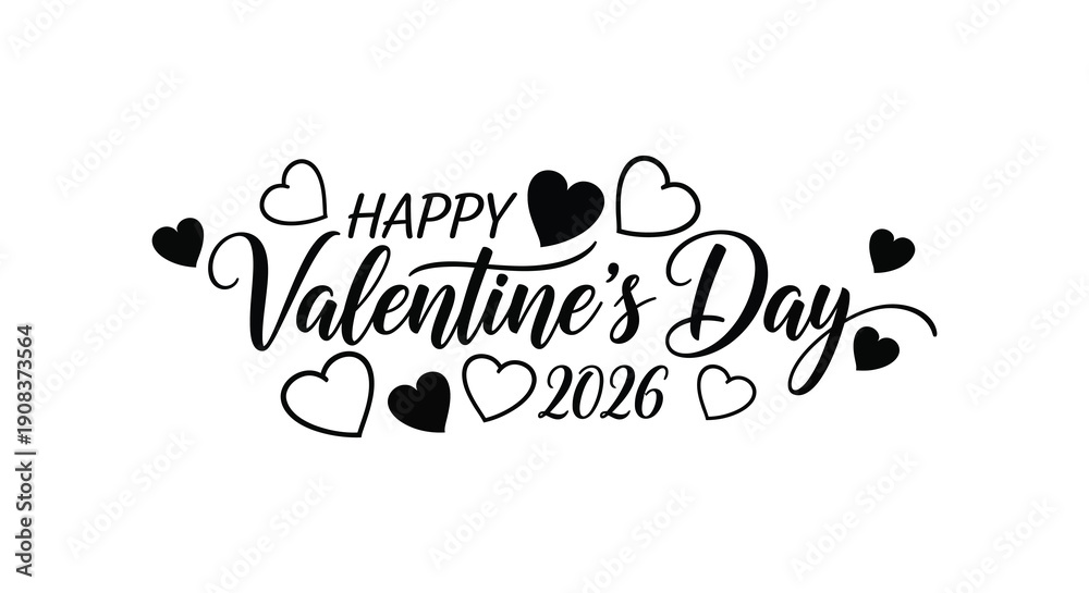 A stylish black and white calligraphy design reads happy valentine s day with hearts and the year 2026 #1908373564