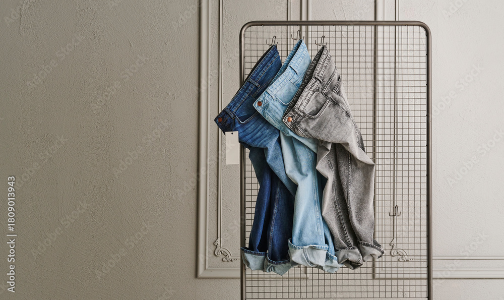 A stylish display of various washed denim jeans hanging on a metal grid rack, showcasing different textures, colors, and modern casual fashion details. #1809013943