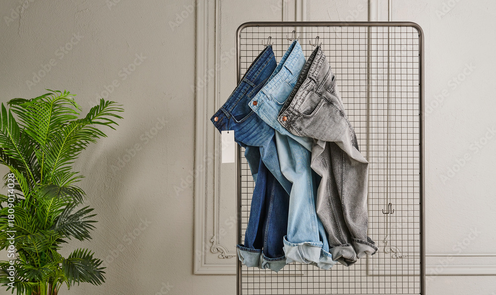 A stylish display of various washed denim jeans hanging on a metal grid rack, showcasing different textures, colors, and modern casual fashion details. #1809014028