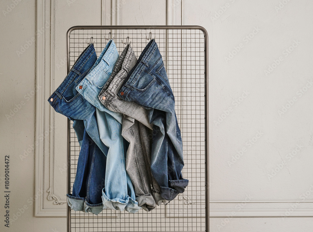A stylish display of various washed denim jeans hanging on a metal grid rack, showcasing different textures, colors, and modern casual fashion details. #1809014472