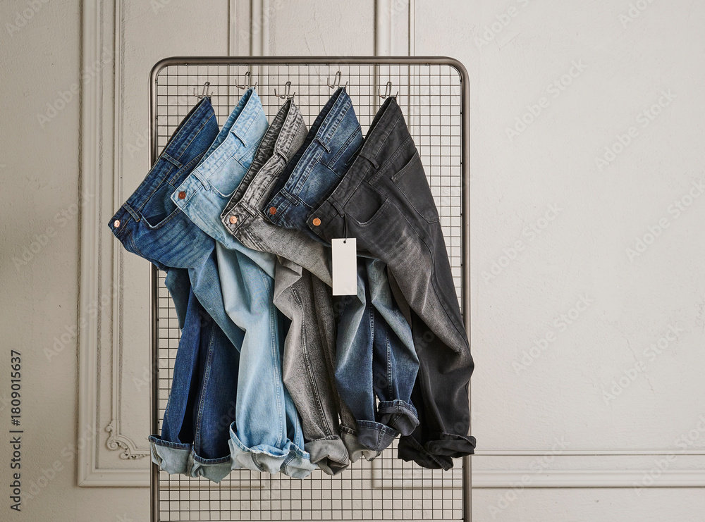 A stylish display of various washed denim jeans hanging on a metal grid rack, showcasing different textures, colors, and modern casual fashion details. #1809015637