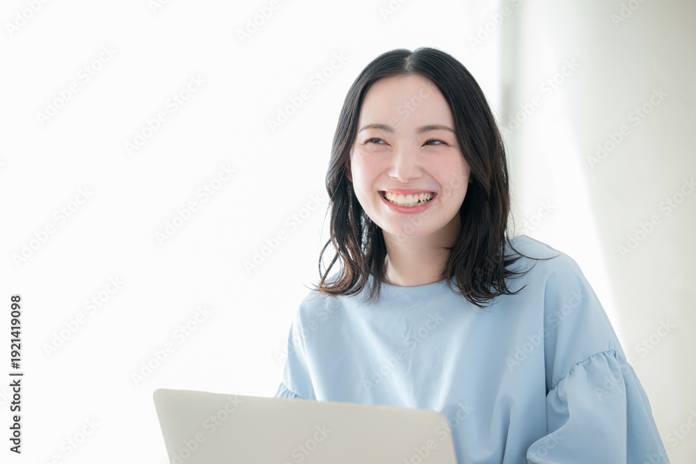A stylish woman working, searching, or researching on her computer in a bright room A positive, forward-thinking image of skill development and career advancement through qualifications and study #1921419098