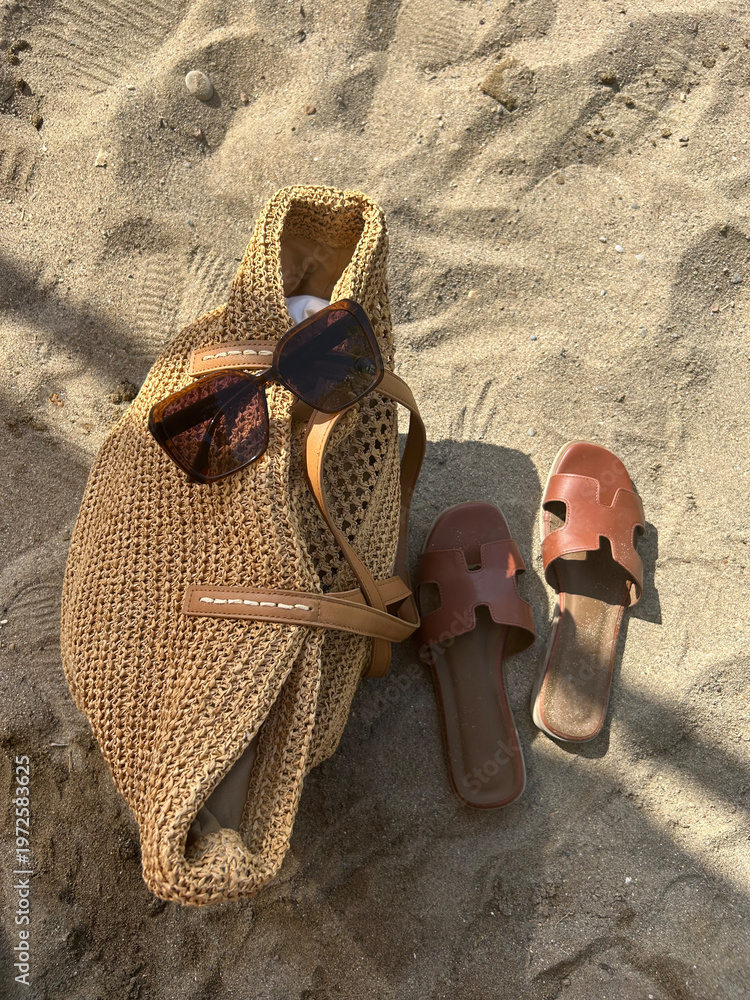 A stylish woven straw tote bag with a eyeglasses, paired with brown leather sandals on sandy beach ground, evoking summer vibes. #1972583625