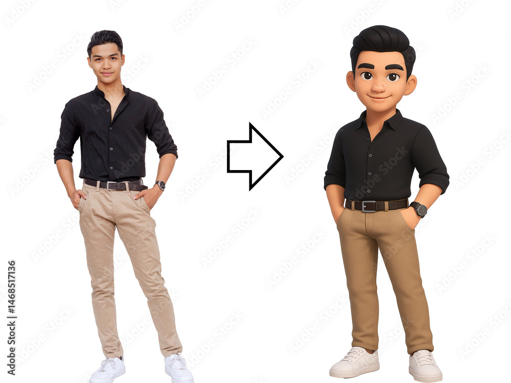 A stylish young man converted into a 3D cartoon-style character using AI, perfect for branding, avatars, or digital content. Cartoonized Person using generative AI. #1468517136