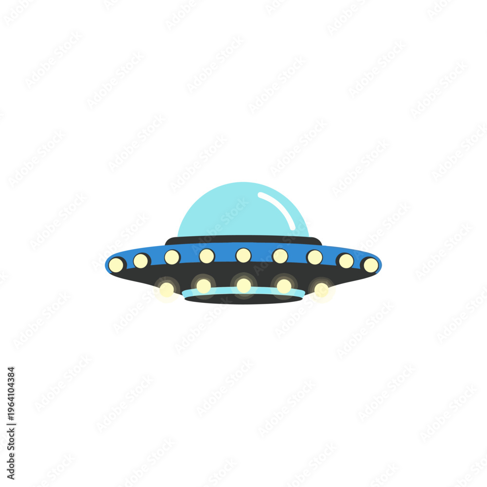 a stylized flat design ufo spaceship with bright yellow lights perfect for illustrating alien technology space travel and extraterrestrial themes. #1964104384