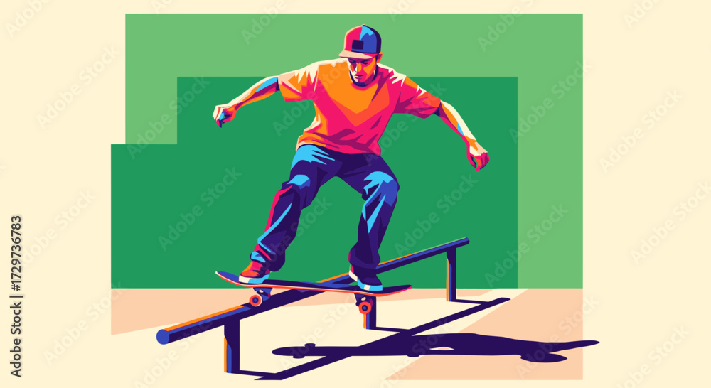 A stylized illustration of a skateboarder in colorful clothing performing a grind trick on a metal rail. #1729736783