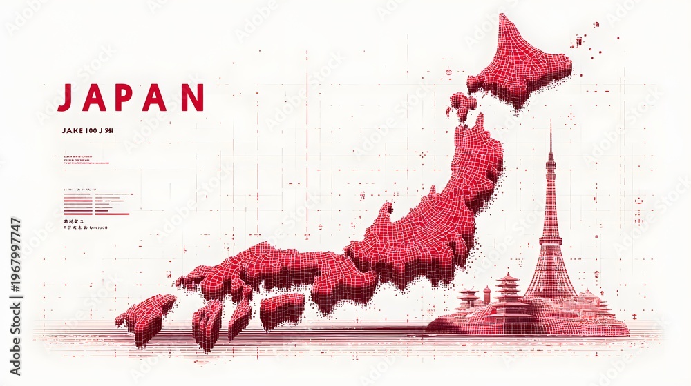 A stylized illustration of Japan's map in red pixels, set against a clean white background. The iconic Tokyo Tower is prominently featured on the right side, adding a touch of urban charm. #1967997747