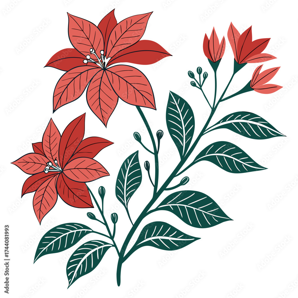 A stylized illustration of red poinsettias with dark green leaves and buds on a white background perfect for holiday and floral designs #1744081993