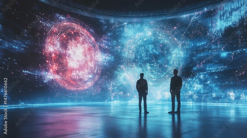 A successful joint venture announcement, partners standing on a futuristic stage, digital projections #1476610662