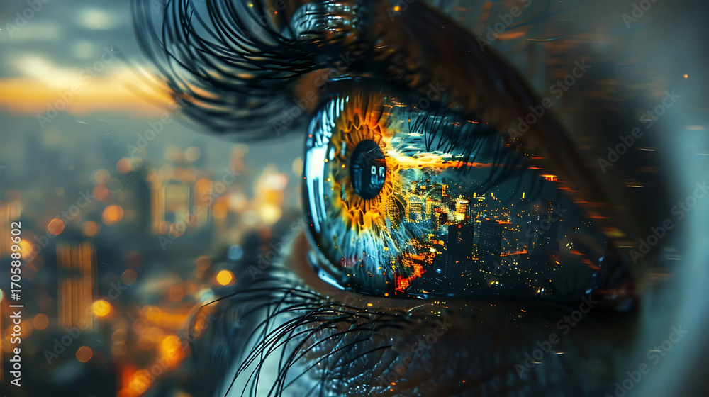 A surreal human eye containing a detailed bustling cityscape, symbolizing urban life, reflection, and the connection between people and cities. #1705889602