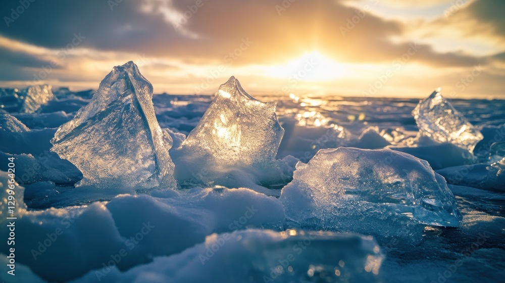 A surreal macro shot of methane ice towers rising from the frozen Antarctic sea, their translucent, jagged shapes glowing as sunlight refracts through them. The desolate, alien-like environment stretc #1299664204