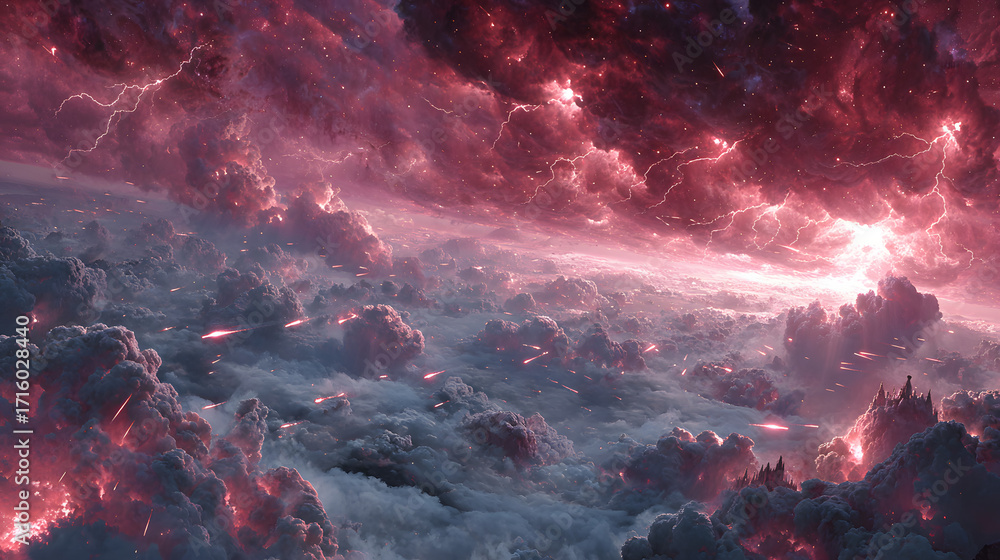 A surreal panoramic battlefield of divine and rebellious legions locked in aerial combat, glowing weapons clashing, ethereal wings ablaze, storm clouds fracturing with crimson lightning, #1716028440