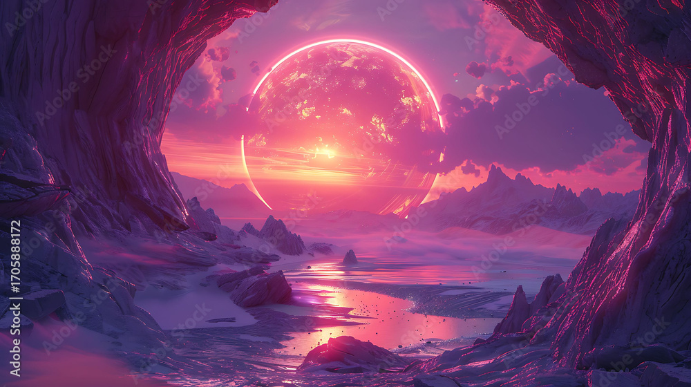 A surreal scene of a vibrant alien world visible through a glowing portal, blending science fiction fantasy with imaginative cosmic landscapes. #1705888172