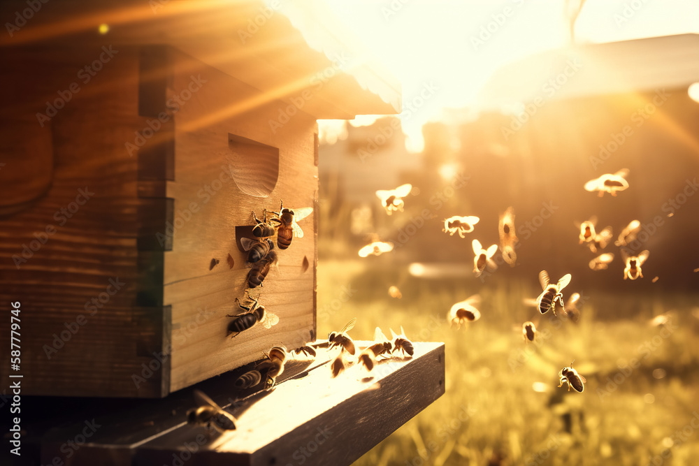 A swarm of bees flying around the hive after a day of collecting nectar from flowers against the setting sun, golden hour. The concept of beekeeping and keeping bees. Generative ai #587779746