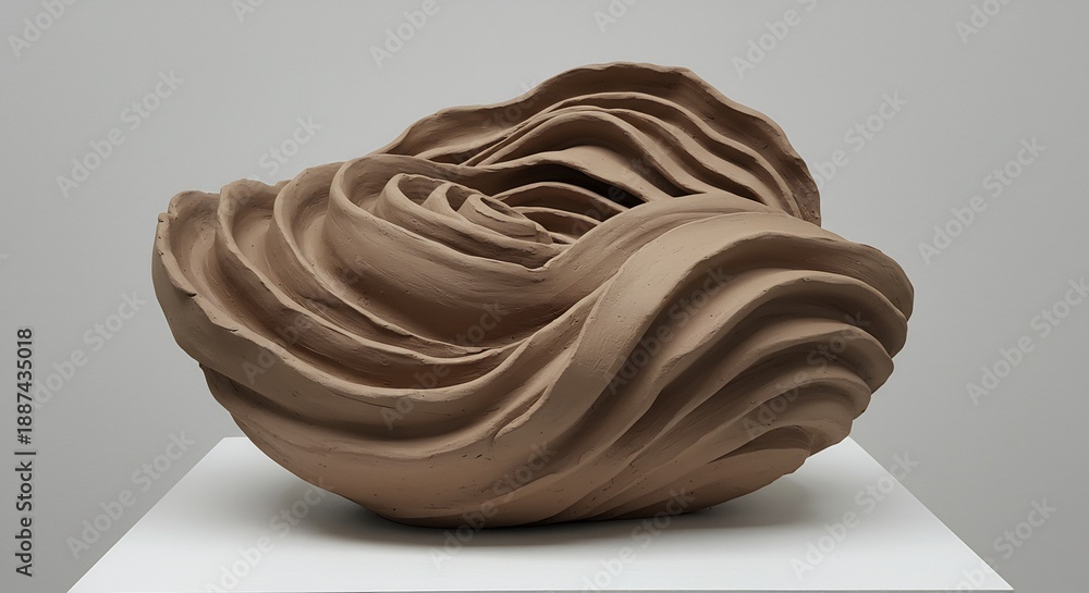 A swirling clay sculpture sits on a white platform against a neutral gray background featuring layered wavelike formations #1887435018
