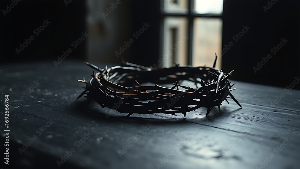 A symbolic crown of thorns resting on a dark surface, representing Christian sacrifice and devotion. #1692566784