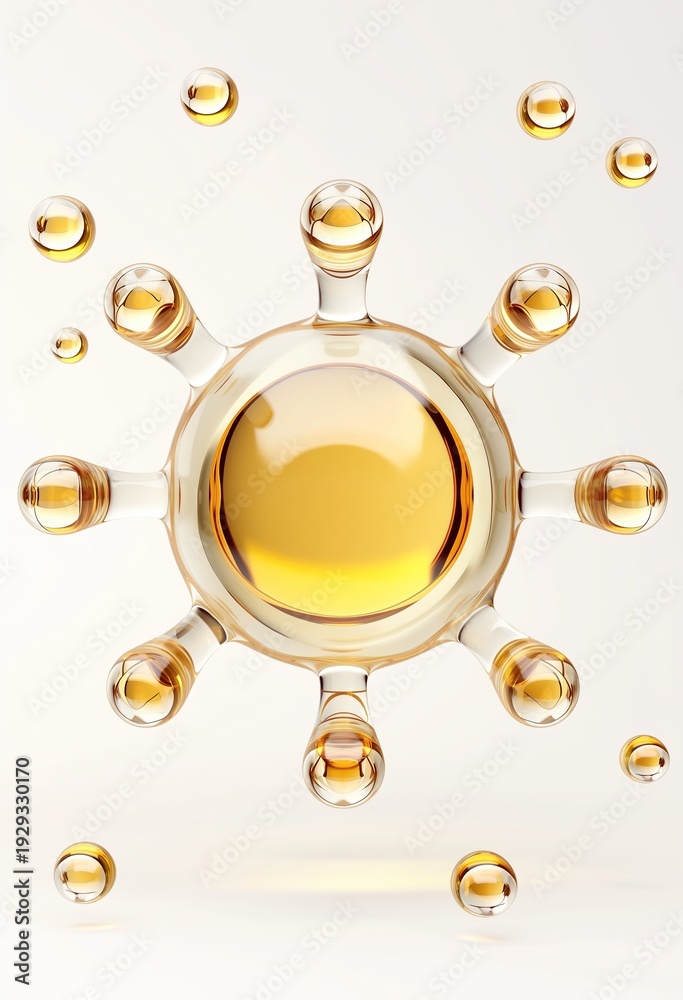 A symmetrical sun shaped circle of floating oil drops containing amber colored liquid is set against a white background for product packaging. #1929330170