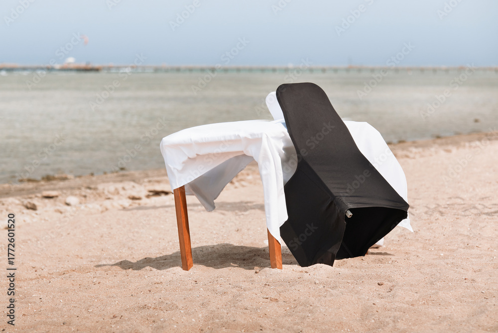 A table with a white tablecloth and a chair on the seashore. Place for a romantic date against a blurred sea. Shallow depth of field #1772601520
