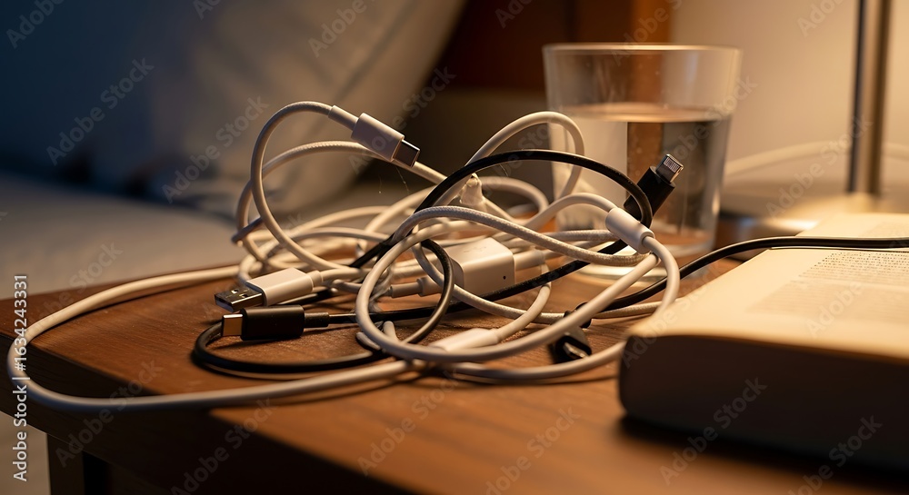 A tangled mess of white and black charging cables and adapters sits on a wooden nightstand next to a glass of water. #1634243331