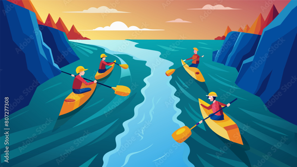 A team of canoeists working together to navigate a particularly narrow and rocky section of the slalom course.. Vector illustration #807277308