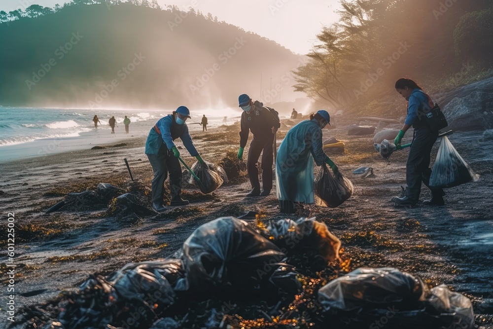 A team of environmentally-conscious workers joining forces to remove plastic litter and debris from a picturesque beach, promoting a cleaner and healthier environment #601225002