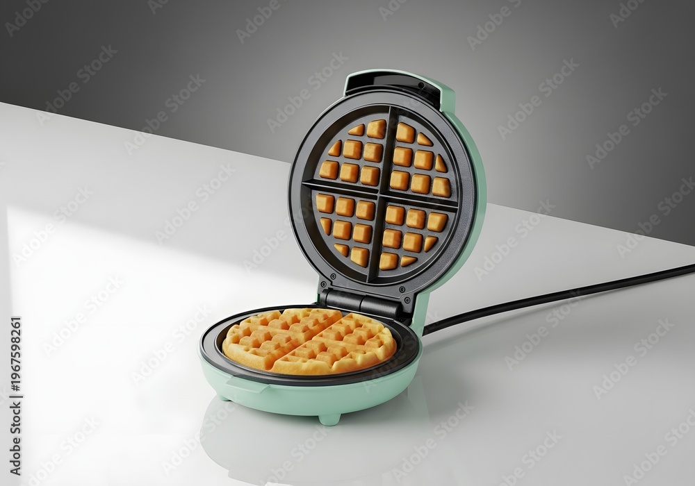 A tempting waffle cooking in a compact, round, mint-colored appliance, ready for a delightful brunch or breakfast, promising a sweet and satisfying start to the day with homemade goodness #1967598261