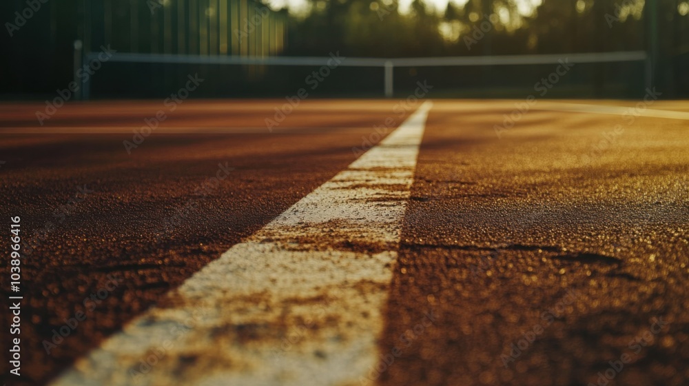 A tennis court's baseline with chalk dust and ball skid marks, outdoor setting with soft evening light, Textured style #1038966416