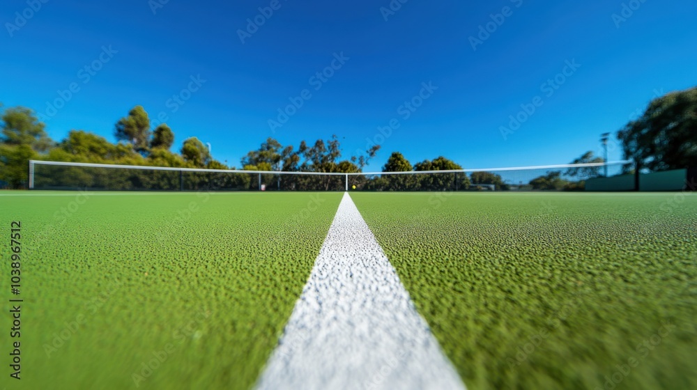 A tennis court's baseline with focus on the painted line, outdoor setting under clear blue sky, Classic style #1038967512