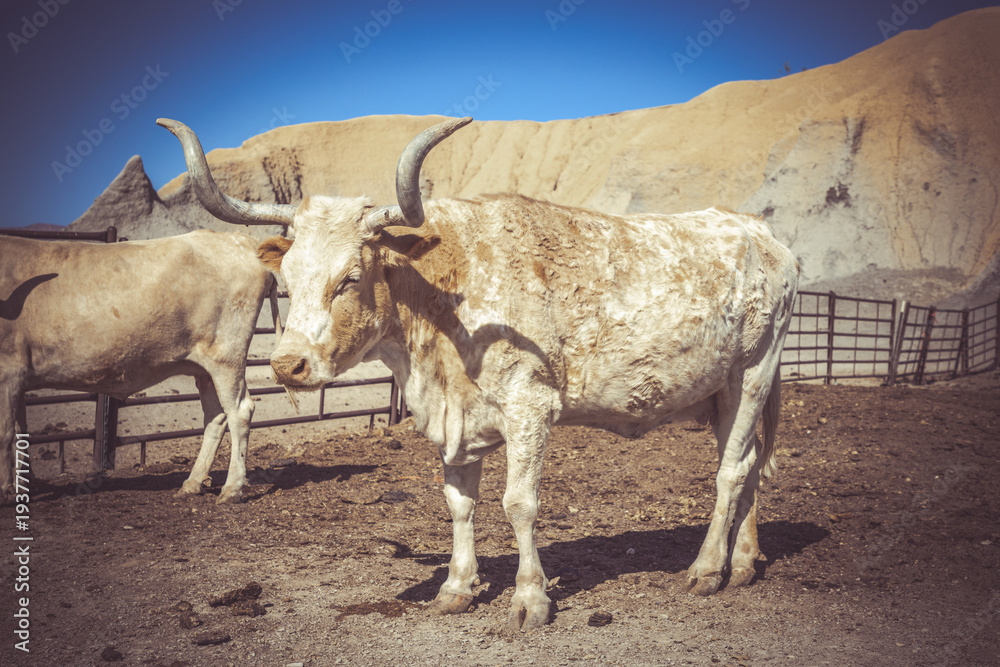 A Texas Longhorn cow with long horns on a paddock #1937717701