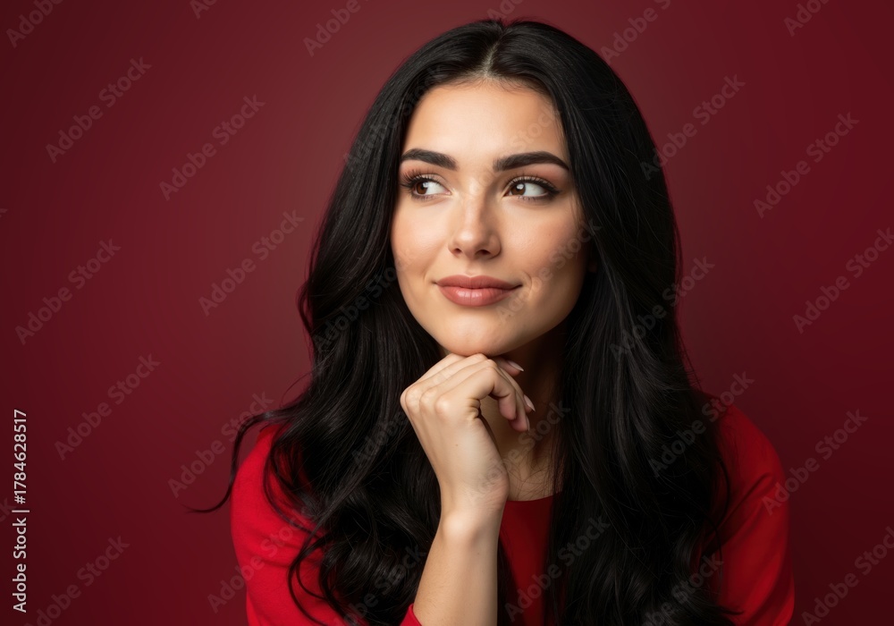 A thoughtful young woman with long dark wavy hair looking away. Portrait of a smiling brunette model with natural makeup on a red background. Beauty and skincare concept #1784628517