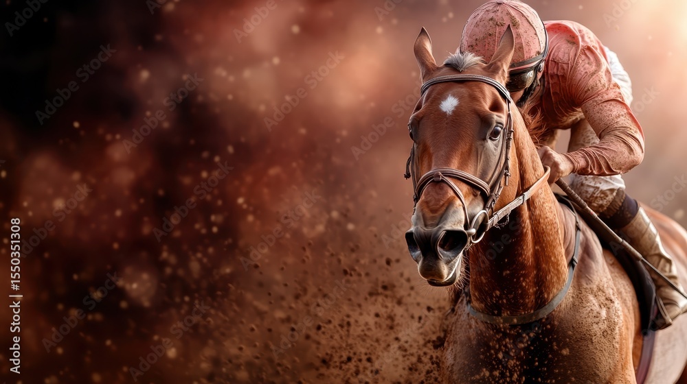 A thrilling image capturing a vibrant racehorse and jockeПr speeding through a smoky track, illustrating the intense adrenaline of horse racing with dynamic movement. #1550351308