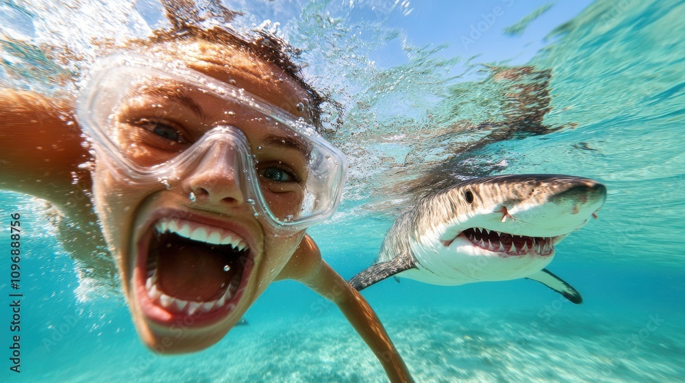A thrilling underwater selfie captures a moment of excitement with a shark swimming nearby, set in pristine, clear water. The image exudes adventure and daring spirit. #1096888756
