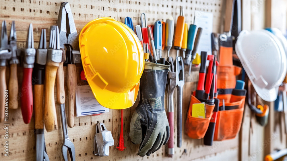 A tidy arrangement of construction helmets and gloves hangs on a wall at a construction site workshop. The vibrant colors of the helmets contrast with the tools neatly organized nearby #1305065380