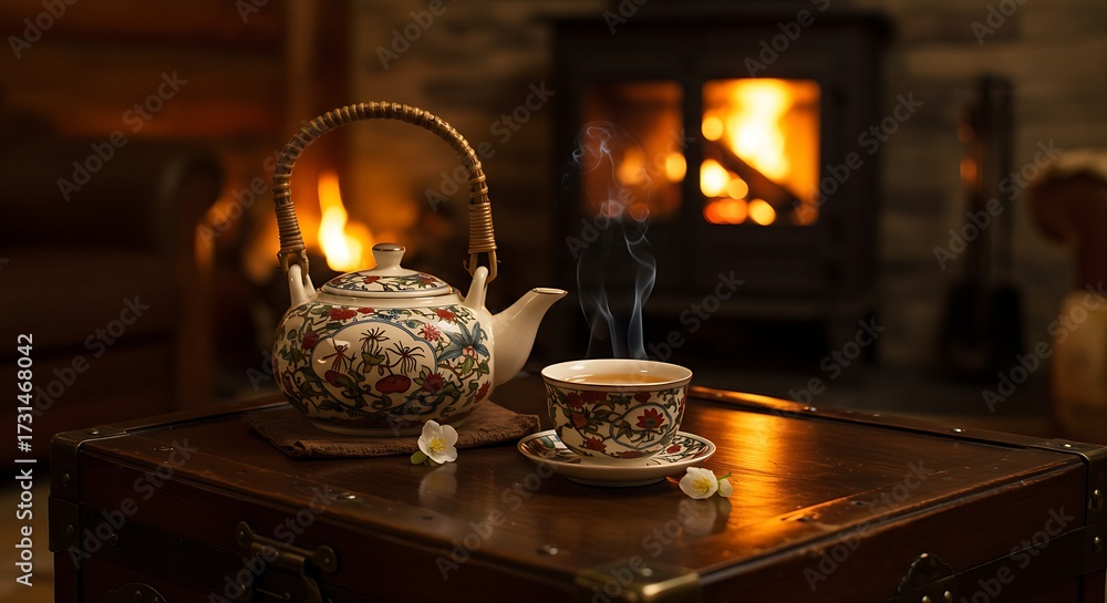 A traditional Chinese tea set with a cup of steaming jasmine tea, placed on a polished, antique wooden chest in a rustic, fire-lit cabin. A glowing fireplace in the background. #1731468042