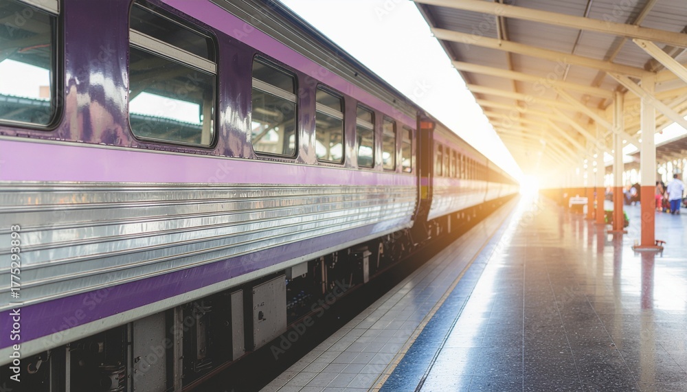 A train carriage at a station, view from the platform with sunlight #1775293893