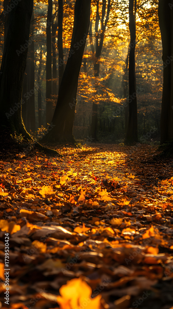 A tranquil forest bathed in golden sunlight - with the changing leaves of autumn creating a vibrant and colorful scene vertical #1739530424