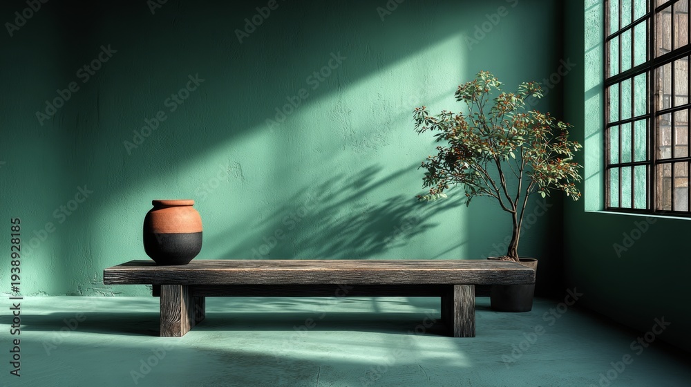 A tranquil minimalist interior showcases a soft pastel green wall, a wooden coffee table, and vibrant potted plants in a bright corner #1938928185