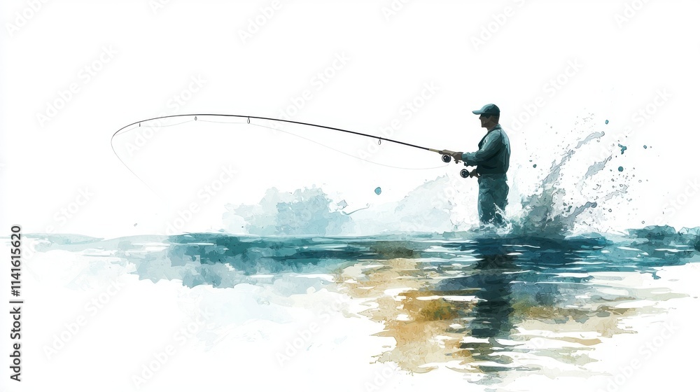 A tranquil scene of a fisherman casting a line into a serene lake, capturing the essence of peaceful outdoor leisure activities. #1141615620