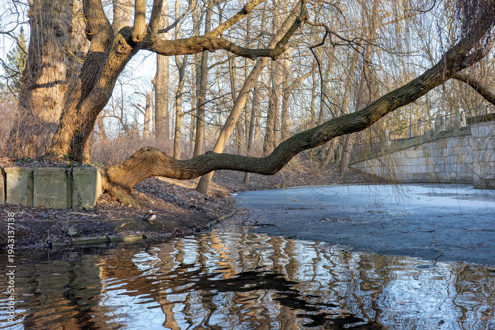 A tranquil winter landscape featuring a curved tree trunk arching over a partially frozen pond. #1943137138