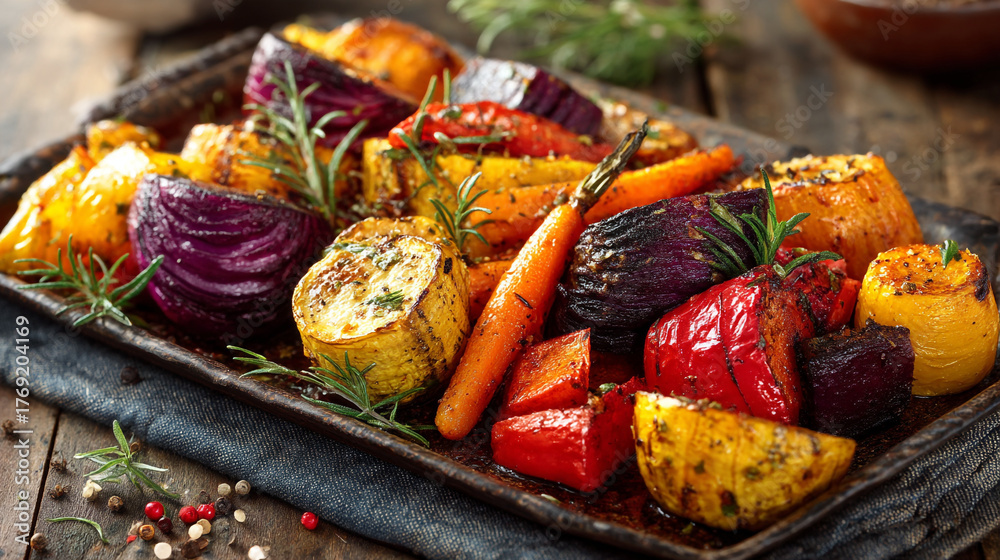 A tray of roasted vegetables including carrots peppers and red onions on wood #1769204169