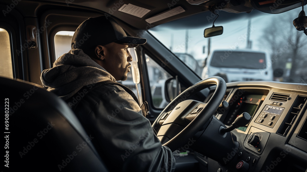 A truck driver in the driver's seat, preparing for a long haul, Truck driver, blurred background, with copy space #690802223