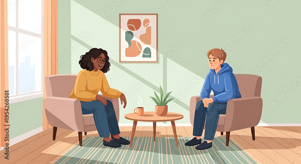 A vector graphic illustration of a therapist and patient in a cozy living room setting having a conversation. #1954268501