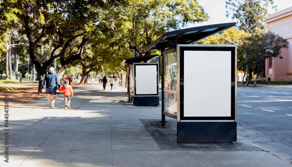 A vertical blank billboard at a bus stop shelter in Buenos Aires, Argentina along Libertador avenue in autumn. Copy space poster into a lightbox to display advertising content. #1445476989