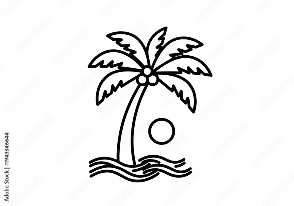 A very cute black line drawing of a palm or coconut tree on an island with the sun and water #1943346644