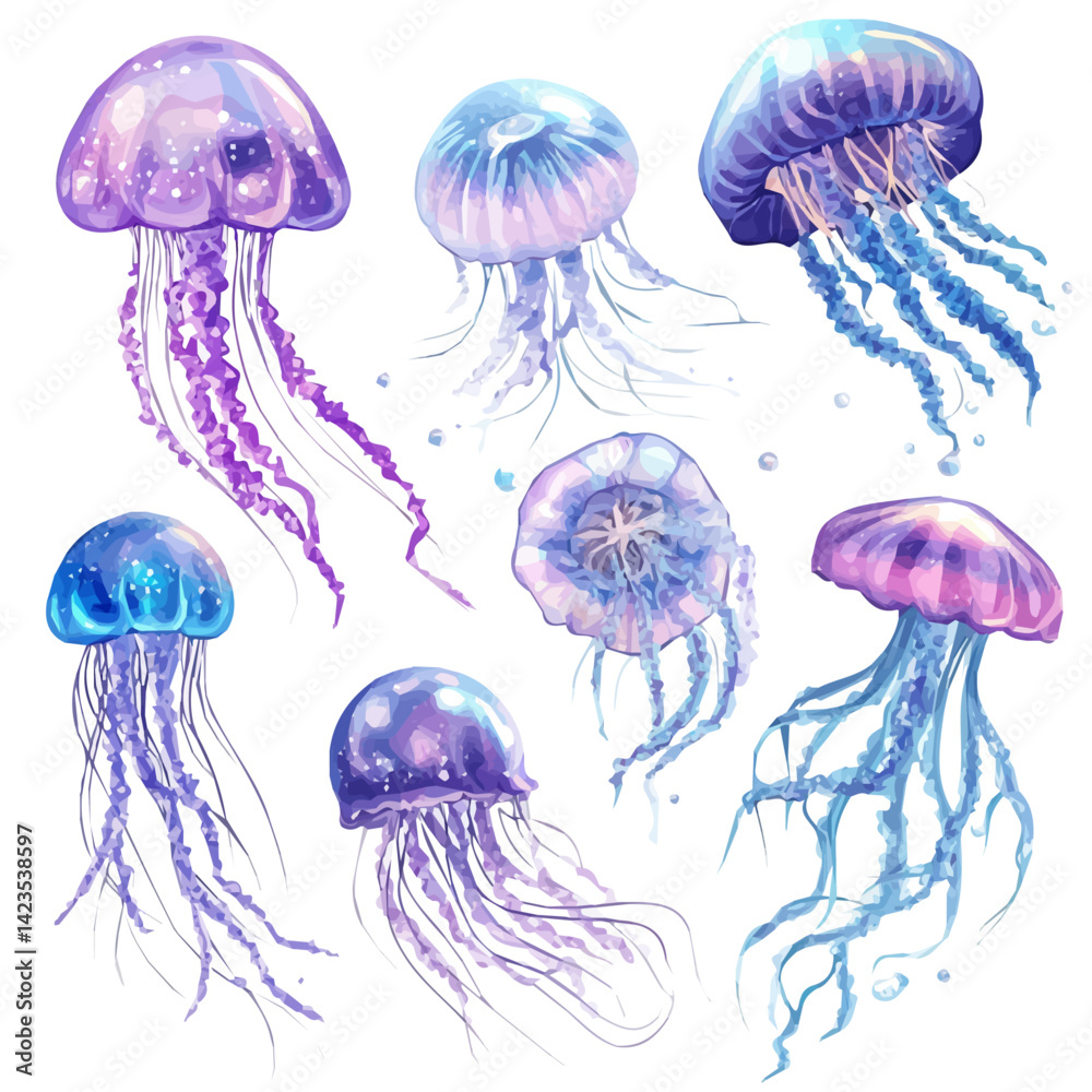 A Very Simple flat 2D icon of a Collection of jellyfish elements isolated on a transparent background, vector, flat design, simple flat 2D icon, eps format #1423538597