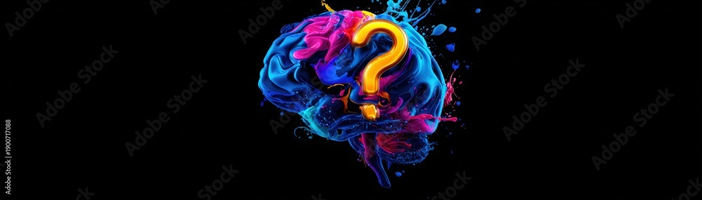 A vibrant, artistic depiction of a brain intertwined with colorful splashes and a question mark, symbolizing curiosity and creativity. #1900717088