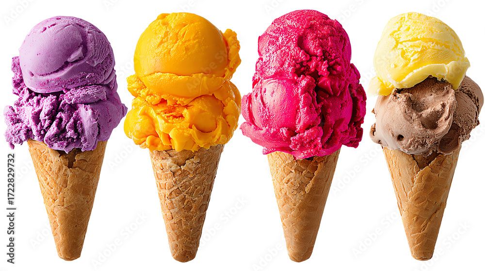 A vibrant assortment of ice cream cones featuring four delightful flavors: purple, yellow, pink, and brown. Perfect for summer treats and dessert cravings. #1722829732